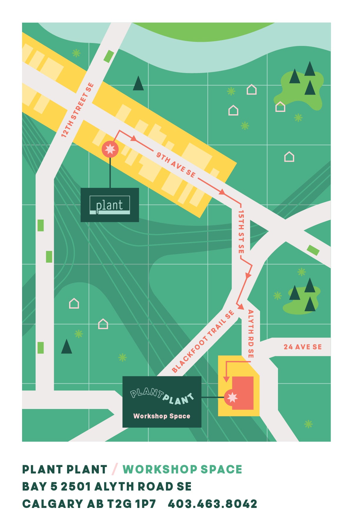 Our workshop space is located in our sister shop Plant Plant, located at 5-2501 Alyth Road SE. Please see the map here. It is just minutes away from our flagship store in the heart of Inglewood.