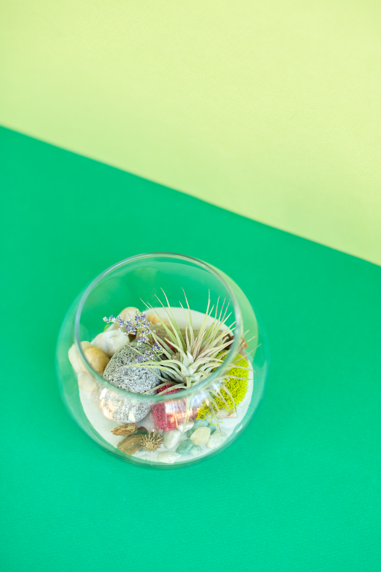 If the space you wish to put your terrarium has indirect light, that is perfect for an airplant terrarium! Too much direct light and these little guys crisp up.