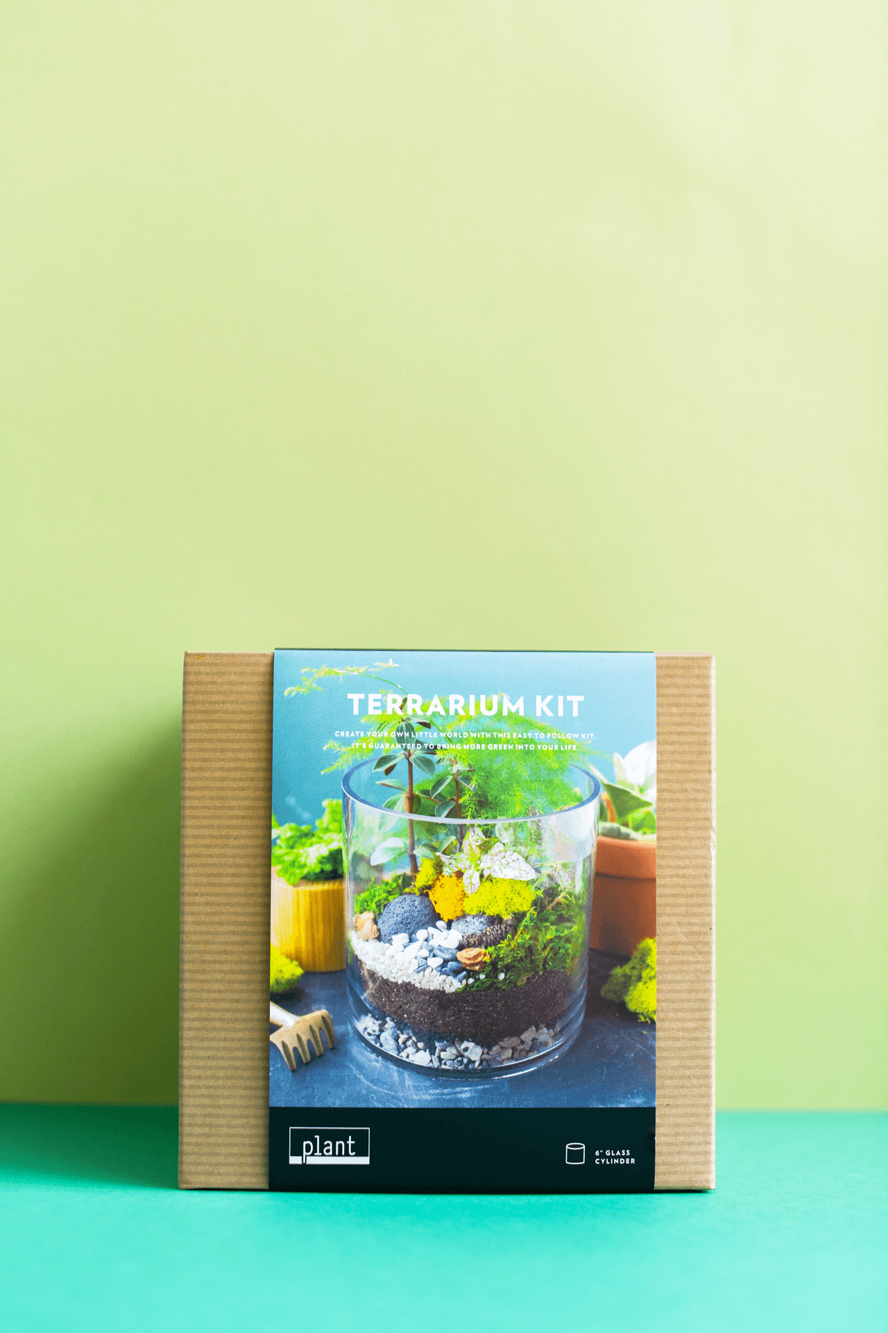 This kit includes: Our Terrarium Guide Book, 6" Glass Cylinder, Gravel, Activated Charcoal, Soil, Sand, River Rock, Decorative Materials, Reindeer Moss. (No Plants included)