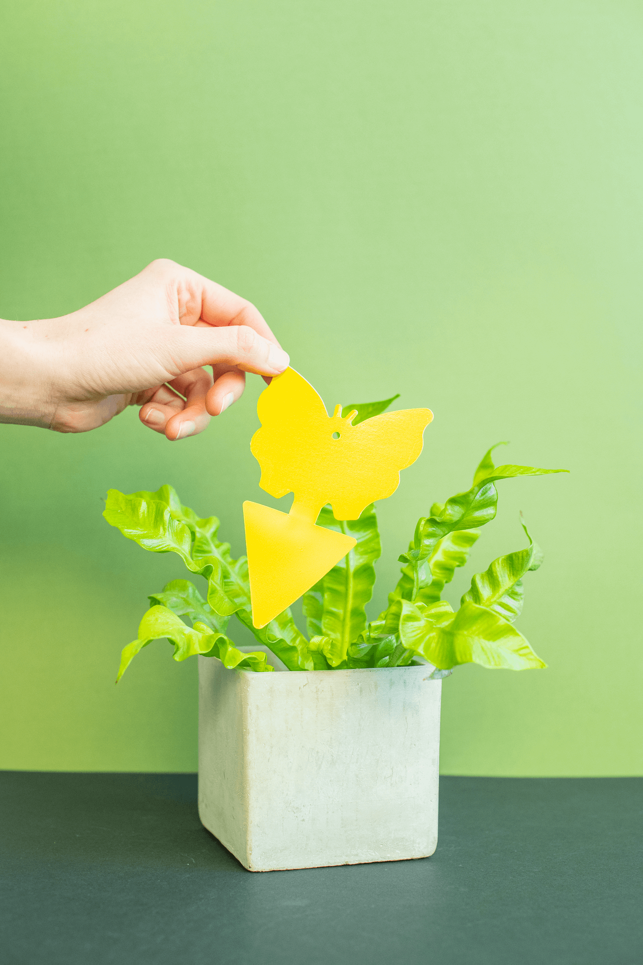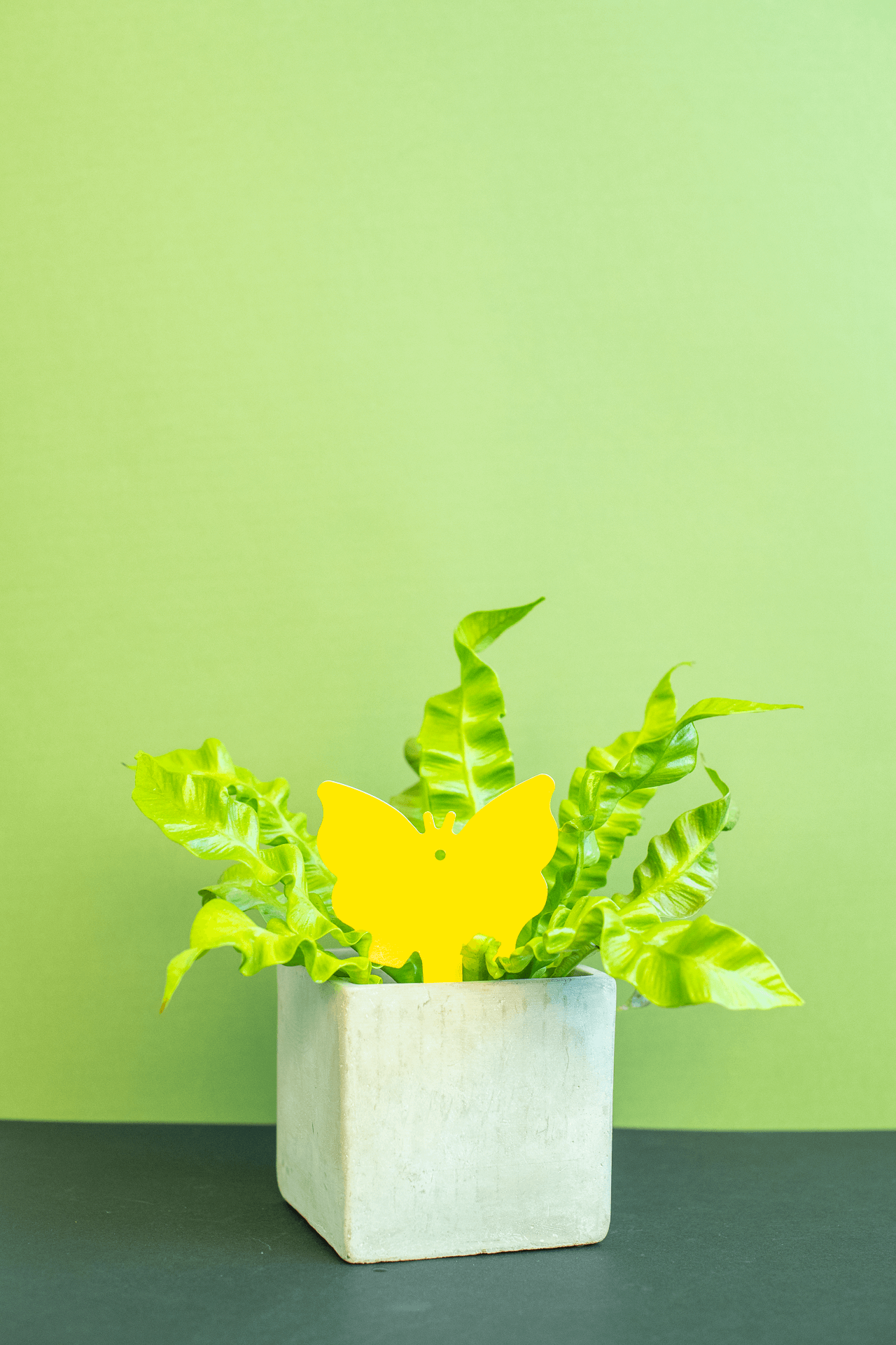 Butterfly or flower shaped and bright yellow, now that's the best way to deal with pests! These sticky traps are dual sided and perfect to catch gnats. Each package includes 20 traps, top-tier hangers, a miniature shovel, and two stakes.